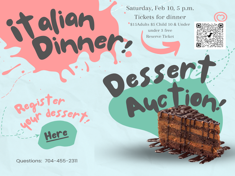 Join us for an evening of great food and lots of fun. Start the evening with an amazing Italian dinner, served to you by our youth. After dinner, the fun begins as we auction off some great desserts. As the bids go up so does the fun and so does the funding for our youths mission trip. The goal for ticket sales is $3000, if the tickets sales reach $3000. Pastor Richards hair will be dyed BLUE. This event is filled with fun and fellowship. We invite you to join us.